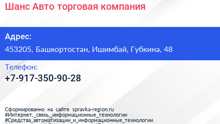 Шанс-Авто, торговая компания по адресу 453205, Башкортостан, Ишимбай, Губкина, 48 в дальнейшем Организация, размещена в следующих категориях: