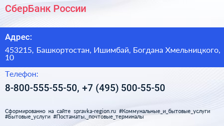 СберБанк России по адресу 453215, Башкортостан, Ишимбай, Богдана Хмельницкого, 10 в дальнейшем Организация, размещена в следующих категориях:
