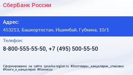 СберБанк России по адресу 453213, Башкортостан, Ишимбай, Губкина, 10/1 в дальнейшем Организация, размещена в следующих категориях: