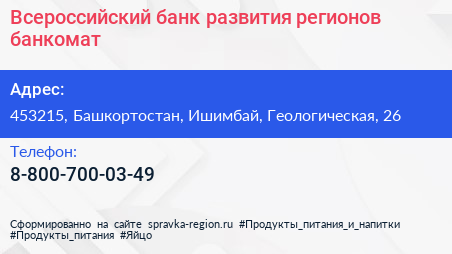 Всероссийский банк развития регионов, банкомат по адресу 453215, Башкортостан, Ишимбай, Геологическая, 26 в дальнейшем Организация, размещена в следующих категориях: