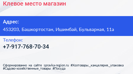 Клевое место, магазин по адресу 453203, Башкортостан, Ишимбай, Бульварная, 11а в дальнейшем Организация, размещена в следующих категориях: