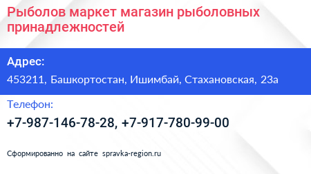 Рыболов маркет, магазин рыболовных принадлежностей по адресу 453211, Башкортостан, Ишимбай, Стахановская, 23а в дальнейшем Организация, размещена в следующих категориях: