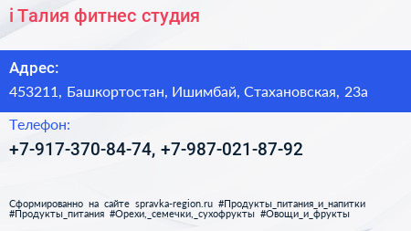 i-Талия, фитнес студия по адресу 453211, Башкортостан, Ишимбай, Стахановская, 23а в дальнейшем Организация, размещена в следующих категориях: