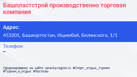 Башпластстрой, производственно-торговая компания по адресу 453201, Башкортостан, Ишимбай, Белинского, 1/1 в дальнейшем Организация, размещена в следующих категориях: