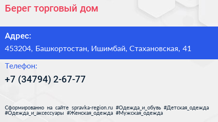 Берег, торговый дом по адресу 453204, Башкортостан, Ишимбай, Стахановская, 41 в дальнейшем Организация, размещена в следующих категориях: