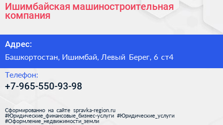Ишимбайская машиностроительная компания по адресу Башкортостан, Ишимбай, Левый Берег, 6 ст4 в дальнейшем Организация, размещена в следующих категориях: