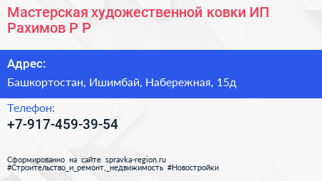 Мастерская художественной ковки, ИП Рахимов Р.Р. по адресу Башкортостан, Ишимбай, Набережная, 15д в дальнейшем Организация, размещена в следующих категориях: