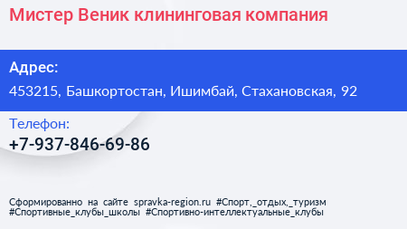 Мистер Веник, клининговая компания по адресу 453215, Башкортостан, Ишимбай, Стахановская, 92 в дальнейшем Организация, размещена в следующих категориях: