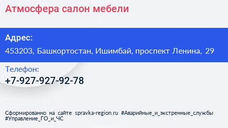 Атмосфера, салон мебели по адресу 453203, Башкортостан, Ишимбай, проспект Ленина, 29 в дальнейшем Организация, размещена в следующих категориях: