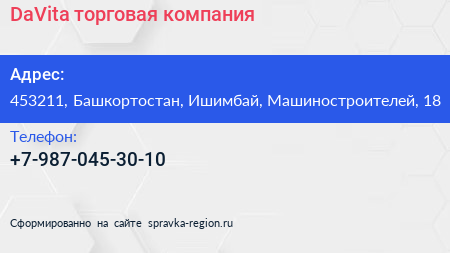 DaVita, торговая компания по адресу 453211, Башкортостан, Ишимбай, Машиностроителей, 18 в дальнейшем Организация, размещена в следующих категориях: