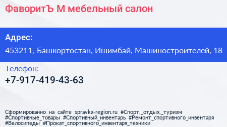 ФаворитЪ М, мебельный салон по адресу 453211, Башкортостан, Ишимбай, Машиностроителей, 18 в дальнейшем Организация, размещена в следующих категориях: