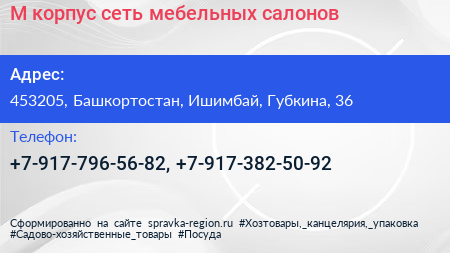 М-корпус, сеть мебельных салонов по адресу 453205, Башкортостан, Ишимбай, Губкина, 36 в дальнейшем Организация, размещена в следующих категориях: