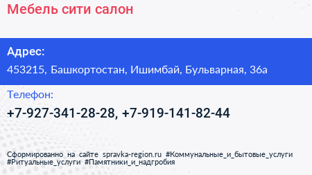 Мебель сити, салон по адресу 453215, Башкортостан, Ишимбай, Бульварная, 36а в дальнейшем Организация, размещена в следующих категориях: