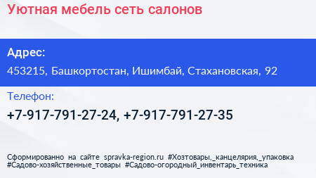 Уютная мебель, сеть салонов по адресу 453215, Башкортостан, Ишимбай, Стахановская, 92 в дальнейшем Организация, размещена в следующих категориях:
