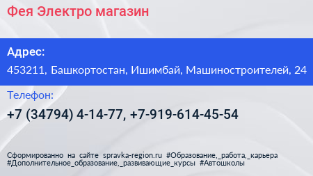 Фея-Электро, магазин по адресу 453211, Башкортостан, Ишимбай, Машиностроителей, 24 в дальнейшем Организация, размещена в следующих категориях: