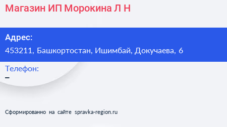 Магазин, ИП Морокина Л.Н. по адресу 453211, Башкортостан, Ишимбай, Докучаева, 6 в дальнейшем Организация, размещена в следующих категориях: