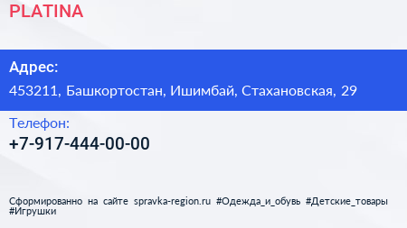 PLATINA по адресу 453211, Башкортостан, Ишимбай, Стахановская, 29 в дальнейшем Организация, размещена в следующих категориях: