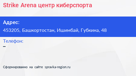 Strike Arena, центр киберспорта по адресу 453205, Башкортостан, Ишимбай, Губкина, 48 в дальнейшем Организация, размещена в следующих категориях: