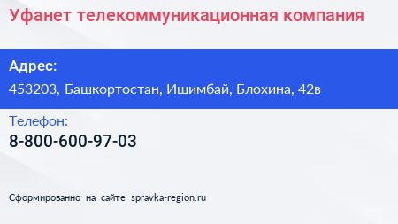 Уфанет, телекоммуникационная компания по адресу 453203, Башкортостан, Ишимбай, Блохина, 42в в дальнейшем Организация, размещена в следующих категориях: