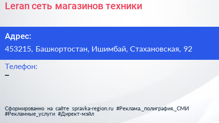 Leran, сеть магазинов техники по адресу 453215, Башкортостан, Ишимбай, Стахановская, 92 в дальнейшем Организация, размещена в следующих категориях: