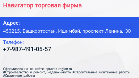 Навигатор, торговая фирма по адресу 453215, Башкортостан, Ишимбай, проспект Ленина, 30 в дальнейшем Организация, размещена в следующих категориях: