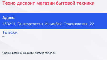 Техно % дисконт, магазин бытовой техники по адресу 453211, Башкортостан, Ишимбай, Стахановская, 22 в дальнейшем Организация, размещена в следующих категориях: