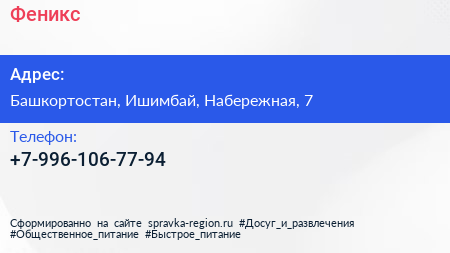 Феникс по адресу Башкортостан, Ишимбай, Набережная, 7 в дальнейшем Организация, размещена в следующих категориях: