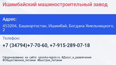 Ишимбайский машиностроительный завод по адресу 453204, Башкортостан, Ишимбай, Богдана Хмельницкого, 2 в дальнейшем Организация, размещена в следующих категориях:
