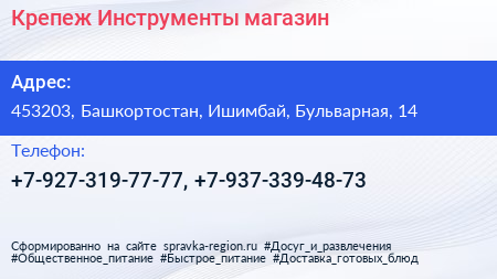Крепеж Инструменты, магазин по адресу 453203, Башкортостан, Ишимбай, Бульварная, 14 в дальнейшем Организация, размещена в следующих категориях: