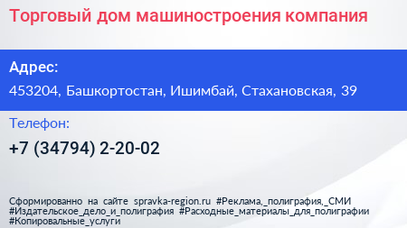 Торговый дом машиностроения, компания по адресу 453204, Башкортостан, Ишимбай, Стахановская, 39 в дальнейшем Организация, размещена в следующих категориях: