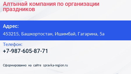 Алтынай, компания по организации праздников по адресу 453215, Башкортостан, Ишимбай, Гагарина, 5а в дальнейшем Организация, размещена в следующих категориях:
