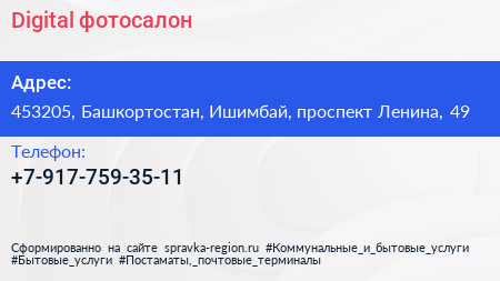 Digital, фотосалон по адресу 453205, Башкортостан, Ишимбай, проспект Ленина, 49 в дальнейшем Организация, размещена в следующих категориях:
