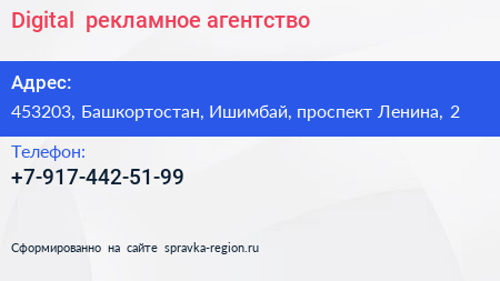 Digital+, рекламное агентство по адресу 453203, Башкортостан, Ишимбай, проспект Ленина, 2 в дальнейшем Организация, размещена в следующих категориях: