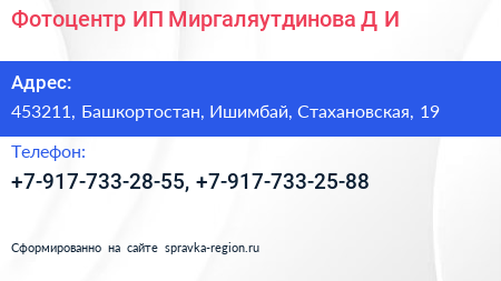 Фотоцентр, ИП Миргаляутдинова Д.И. по адресу 453211, Башкортостан, Ишимбай, Стахановская, 19 в дальнейшем Организация, размещена в следующих категориях: