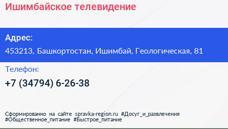 Ишимбайское телевидение по адресу 453213, Башкортостан, Ишимбай, Геологическая, 81 в дальнейшем Организация, размещена в следующих категориях: