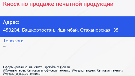 Киоск по продаже печатной продукции по адресу 453204, Башкортостан, Ишимбай, Стахановская, 35 в дальнейшем Организация, размещена в следующих категориях:
