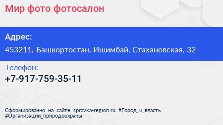 Мир фото, фотосалон по адресу 453211, Башкортостан, Ишимбай, Стахановская, 32 в дальнейшем Организация, размещена в следующих категориях: