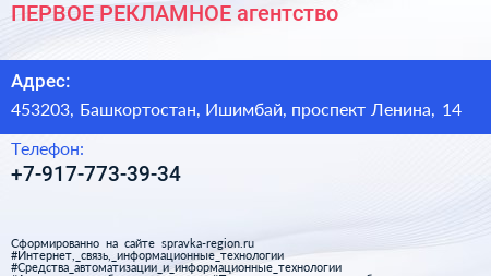 ПЕРВОЕ РЕКЛАМНОЕ, агентство по адресу 453203, Башкортостан, Ишимбай, проспект Ленина, 14 в дальнейшем Организация, размещена в следующих категориях: