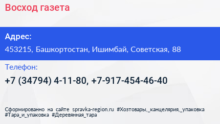 Восход, газета по адресу 453215, Башкортостан, Ишимбай, Советская, 88 в дальнейшем Организация, размещена в следующих категориях: