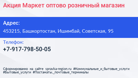 Акция Маркет, оптово-розничный магазин по адресу 453215, Башкортостан, Ишимбай, Советская, 95 в дальнейшем Организация, размещена в следующих категориях: