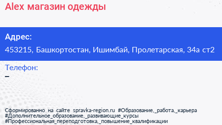 Alex, магазин одежды по адресу 453215, Башкортостан, Ишимбай, Пролетарская, 34а ст2 в дальнейшем Организация, размещена в следующих категориях: