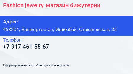 Fashion jewelry, магазин бижутерии по адресу 453204, Башкортостан, Ишимбай, Стахановская, 35 в дальнейшем Организация, размещена в следующих категориях: