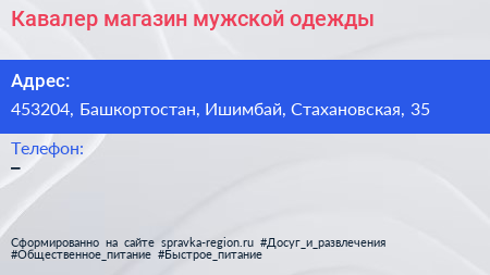Кавалер, магазин мужской одежды по адресу 453204, Башкортостан, Ишимбай, Стахановская, 35 в дальнейшем Организация, размещена в следующих категориях:
