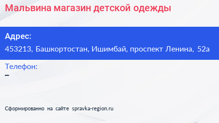 Мальвина, магазин детской одежды по адресу 453213, Башкортостан, Ишимбай, проспект Ленина, 52а в дальнейшем Организация, размещена в следующих категориях: