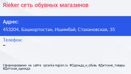 Rieker, сеть обувных магазинов по адресу 453204, Башкортостан, Ишимбай, Стахановская, 35 в дальнейшем Организация, размещена в следующих категориях:
