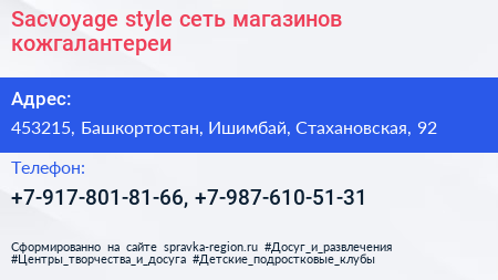 Sacvoyage style, сеть магазинов кожгалантереи по адресу 453215, Башкортостан, Ишимбай, Стахановская, 92 в дальнейшем Организация, размещена в следующих категориях: