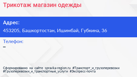 Трикотаж, магазин одежды по адресу 453205, Башкортостан, Ишимбай, Губкина, 36 в дальнейшем Организация, размещена в следующих категориях: