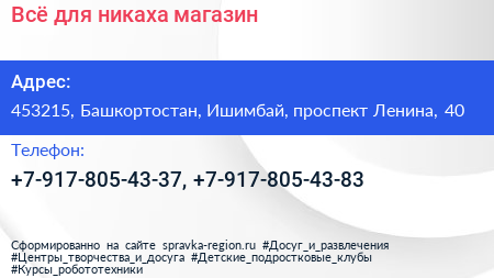 Всё для никаха, магазин по адресу 453215, Башкортостан, Ишимбай, проспект Ленина, 40 в дальнейшем Организация, размещена в следующих категориях: