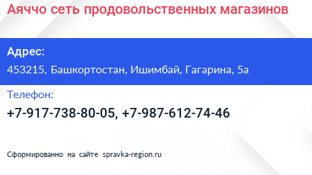 Аяччо, сеть продовольственных магазинов по адресу 453215, Башкортостан, Ишимбай, Гагарина, 5а в дальнейшем Организация, размещена в следующих категориях: