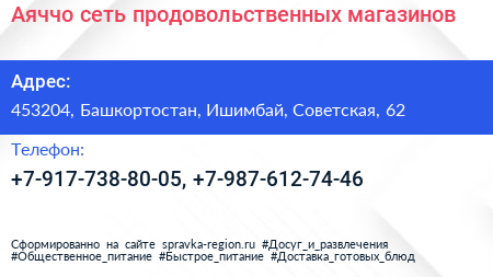 Аяччо, сеть продовольственных магазинов по адресу 453204, Башкортостан, Ишимбай, Советская, 62 в дальнейшем Организация, размещена в следующих категориях: